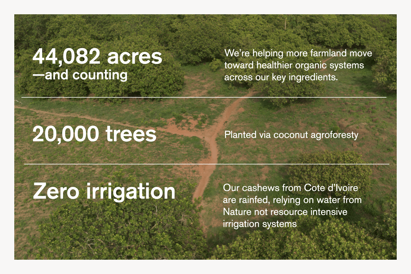 We believe moving away from animal-based dairy is one of the most powerful ways to help both people and the planet. That’s why we’ve invested in climate-smart crops—like organic, rain-fed cashews—that do more with less.